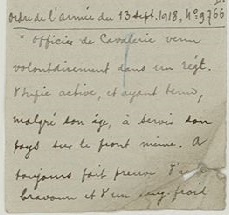 Cité 1 fois à l’ordre du régiment, 2 fois à l’ordre de la brigade et 1 fois à l’ordre du corps d’armée, il est cité à l’ordre de l’armée le 13 septembre 1918 et fait chevalier de la Légion d’Honneur à titre posthume.