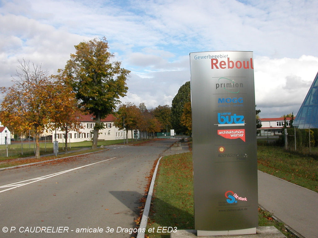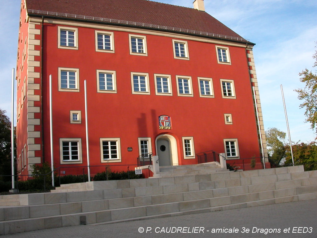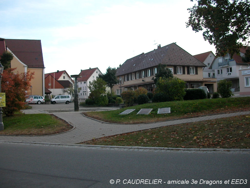 - Tertre près de la fontaine, à côté de la pharmacie et face au restaurant Kreuz où sont installées les plaques commémoratives de la ville. La plaque de bronze concernant la garnison française en général et le 3ème Régiment de Dragons en particulier est à gauche. (Celle de droite concerne le 294, Bataillon allemand.) (format JPEG - 148.7 ko)