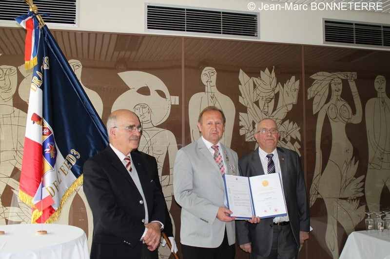 - Remise de la médaille commémorative du 50e anniversaire du traité de l’Elysée au Maire G. HIPP par le colonel PERON et Pierre CAUDRELIER (format JPEG - 127.1 ko)