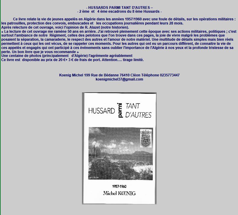 Ci-joint la note bibliographique de l’historien de l’amicale des anciens du 8° Hussards et la photo du livre.