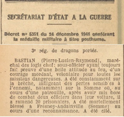 Pierre BASTIAN a reçu la médaille militaire à titre posthume le 24 décembre 1941.