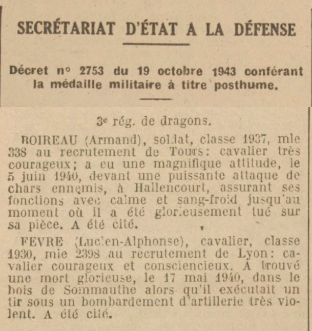 Armand BOIREAU a reçu la médaille militaire à titre posthume le 19 octobre 1943.