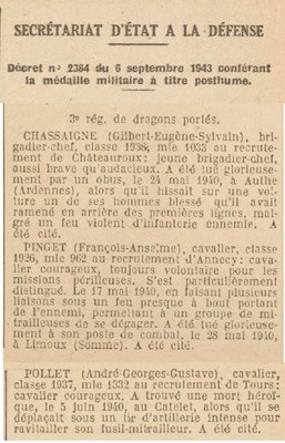Il a reçu la médaille militaire à titre posthume le 6 septembre 1943.