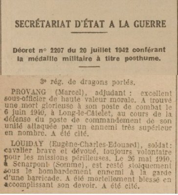 Il a reçu la médaille militaire à titre posthume le 20 juillet 1942.